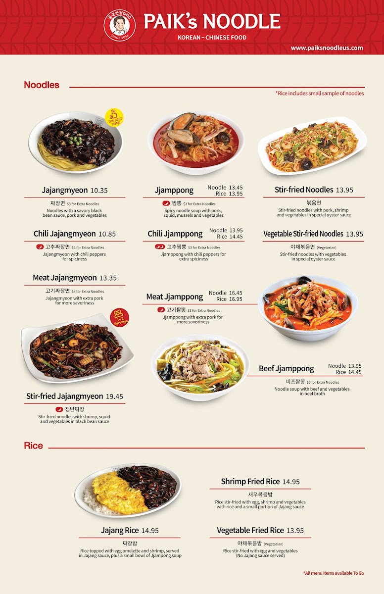 The rice selections, such as Jajang Rice and Shrimp Fried Rice, pair well with mouthwatering sides like Garlic Soy Chicken Wings and Dumplings. Guests rave about the generous portions and the self-service model that enhances the dining experience. With an inviting atmosphere and attentive service, Paik’s Noodle is set to become a beloved spot for both new visitors and returning patrons.
